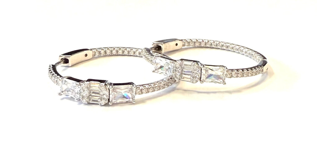 Quinlan Inside Out CZ Hoop Earrings With Three Emerald Shaped Stones